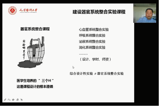 在讲座的后半场,康毅教授结合目前疫情的特殊要求,谈了几点对医学实验改革的思考:第一,通过对动物理论、科学精神、爱国主义、学校校史方面相结合教育,将思政教育融入实验教学;第二,正确理解3R——Reduction(减少)、Replacement(替代)、Refinement(优化),提高实验教学品质和动物质量;第三,综合利用实验动物,提高动物的品质和质量,提高实验教学效比;第四,依靠医学生培养的“三个H”——灵巧的手,机敏的头,仁慈的心,建设器官系统整合实验课程;第五,介绍机能实验新形态——以高质量动物实验为主,虚拟仿真实验其次,另外应该有人体生理实验,吸引学生以机能实验学为依托开展创新论坛暨实验设计大赛的项目。