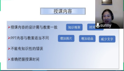 培训会的第二阶段,中文系李想老师和信息科学学院的赵小蕾老师作为第四届省赛的“过来人”,分享了他们的经验和心得。李想老师主要结合省赛文件中的要求进行了答疑式讲解,她针对 “写多长时间的教学设计”、“PPT教学节段如何选择”、“如何体现特色”、“想讲的内容太多/少怎么办”、“现场没有学生互动怎么办”等问题给出自己的理解和建议,并提醒参赛教师注意字体统一、结构相似、内容均衡,提前熟悉比赛规则,调整良好心态。赵小蕾老师主要就大赛的内容、流程和材料准备等方面做了详细的解释,以她的参赛设计为例,结合大赛评分标准,反思了自己在比赛时可能失分的项目,并提出合理、有效的建议,为本届参赛教师提前“避坑”提供了积极的指引。