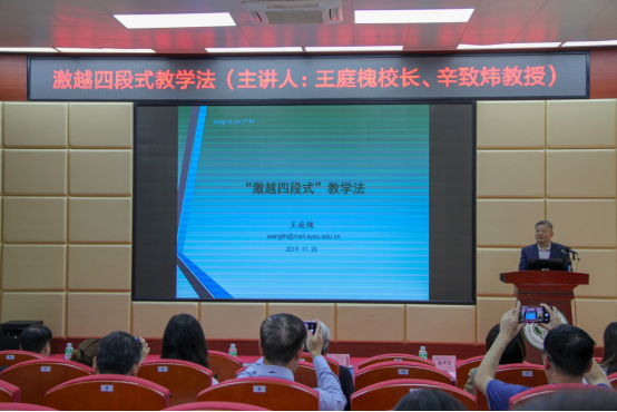本次讲座的上半场由王庭槐校长作“激越四段式教学法”的主题报告。
