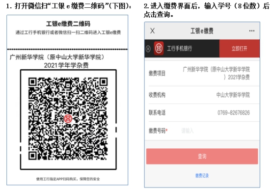 打开工行手机银行APP→点击登录→选择生活缴费(e缴费)→学杂费→选择太阳集团2138(原中山大学新华学院)2021学杂费→输入学号(8位数)→确认反馈信息和选择缴费支付方式→按要求输入缴费验证码或支付密码→支付成功 |