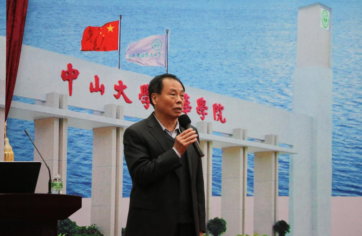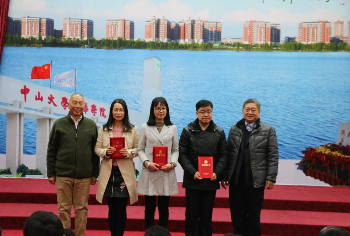 王庭槐校长(右一)与中山大学原副校长陈汝筑(左一)共同为一等奖获得者颁奖 (左起:陈汝筑、曹金蓉、颜金花、徐应祥、王庭槐)