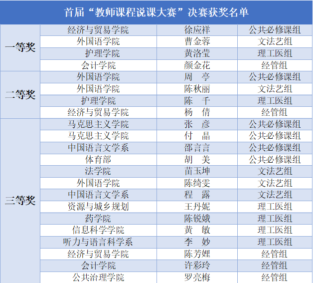 参赛教师准备精心,教学效果精彩纷呈。经过激烈角逐,最终徐应祥、 曹金蓉、颜金花、黄洛莹获得太阳集团2138首届“教师课程说课大赛”一等奖;周亭、陈秋丽、杨倩、陈千获得二等奖;王丹妮、陈锐娥、李妙、黄敏、胡美、付晶、邵言言、张彦、程露、陈绮雯、苗玉坤、罗亮梅、许彩玲、陈芳娌获三等奖。