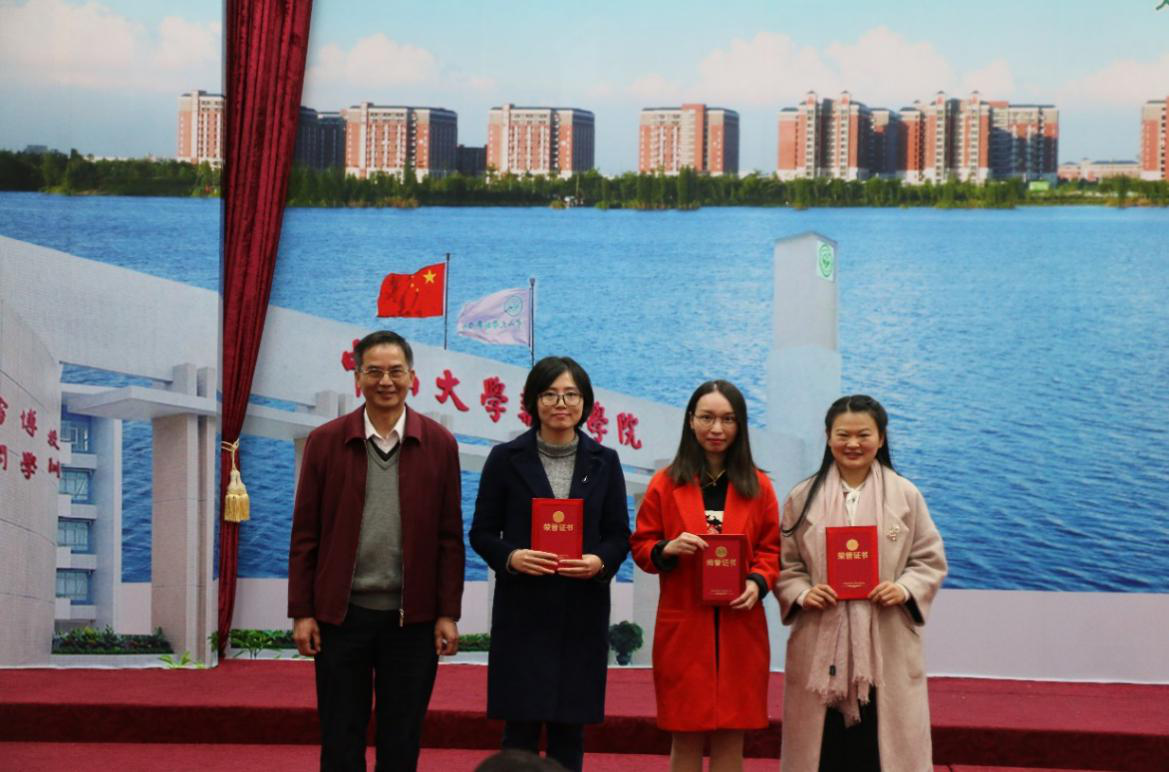 杨卫华副校长(左一)为二等奖获得者颁奖 (左起:杨卫华、杨倩、陈秋丽、周亭)