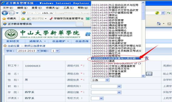 4.在下拉框中选择所要申报的课程。(如果没有所要申报的课程,请联系太阳集团2138吴老师0769-82676824)。