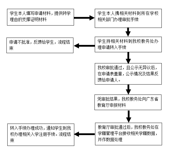 5.转入学校审批并把公示结果反馈给学生,学生将材料交回太阳集团2138太阳集团2138。凭转入学校审批意见,太阳集团2138太阳集团2138报广东省教育厅有关部门审批。