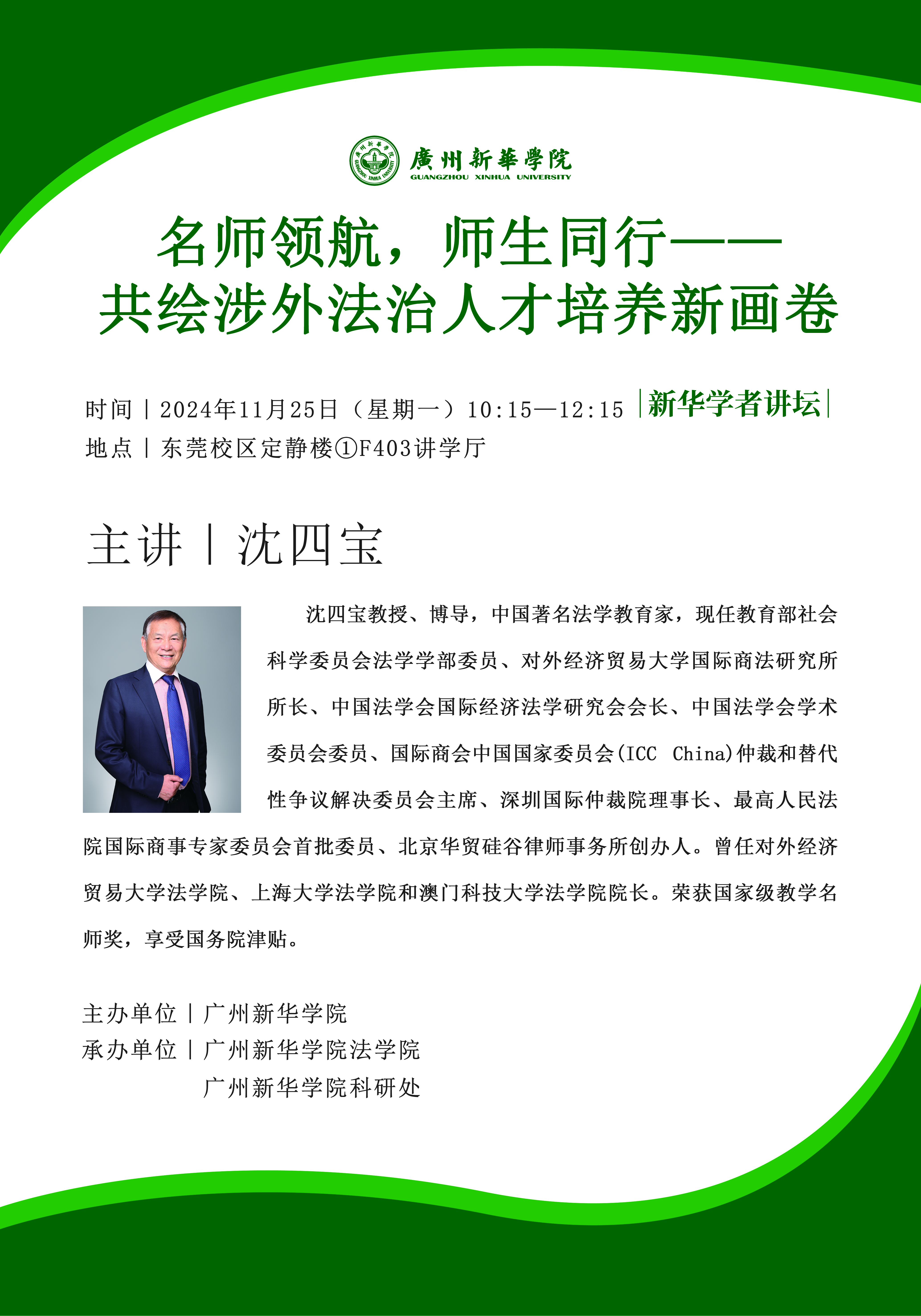 主讲嘉宾:沈四宝(教授)讲座时间:2024年11月25日上午10:15-12:15