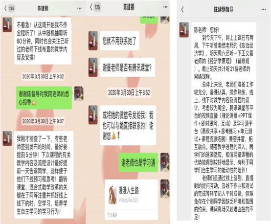 (二)关注学生需求,学院全面跟进落实。各教学单位根据学科特点和实际情况,结合学校的指导,全面保障和落实教学运行和教学质量。经济与贸易学院网络教学质量保障工作小组,深度参与网络课堂,每天收集分析有关教学效果、课程改进提升及教学过程中主要问题等实时数据,确保教学质量与学习成效不降低。药学院网络教学质量保障组每周不少于5次不同班别课程,进入虚拟课堂进行监控,及时发现问题与解决问题。信息科学学院领导、专业主任、课程群长等资深教师深入一线听课近30人次,并与任课教师进行沟通和交流;要求任课教师每周五17:30前向相关课程群群长汇报一周的教学情况。生物医学工程学院辅导员及行政教辅人员“双进课堂”管理模式继续进行并不断改善、调整。