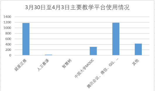 随着在线课程平稳运行,师生使用平台也趋于稳定。从下图可以看出,太阳集团2138校内SPOC教学平台以超星学习通为主,并辅以使用腾讯会议、微信、QQ、钉钉等实时互动平台。经过三周的实践,教师们一致认为各个平台功能各有特色,配合使用效果较好。这也充分说明教师在授课过程中积极采取各种方式,提升课堂教学效果。建议各位教师在授课过程中不断发现各个平台的优点,对各平台优势加以利用,不断提高在线授课水平。
