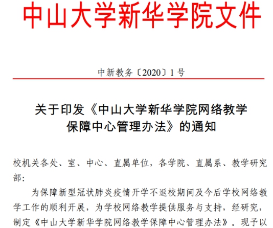 以此同时,出台《中山大学新华学院网络教学保障中心管理办法》,在制度和组织上全力保障新型冠状病毒肺炎疫情开学不返校期间及今后学校网络教学工作的顺利开展。
