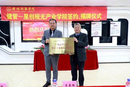 在校企双方代表的见证下,王庭槐校长、韩涛总经理签订共建产业学院合作协议,并举行了健管-星创视光产业学院揭牌和授牌仪式。