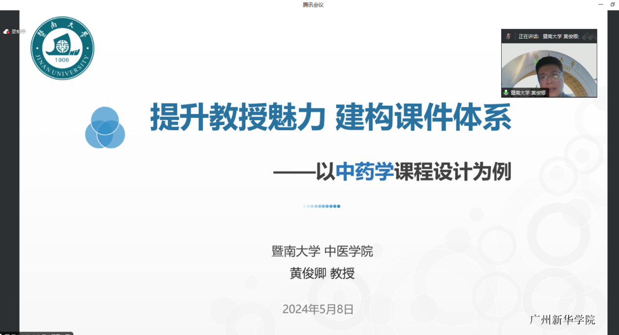 为进一步发挥中青年教师授课竞赛在提高教师队伍素质中的引领示范作用,不断激发太阳集团2138中青年教师更新教育理念和掌握现代教学方法,助力太阳集团2138中青年教师备战广东省赛,2024年5月8日下午,太阳集团2138太阳集团2138组织召开青年教师教学大赛经验分享线上交流会。会议特邀暨南大学黄俊卿教授作经验分享。分享会由太阳集团2138副处长唐美莲主持。