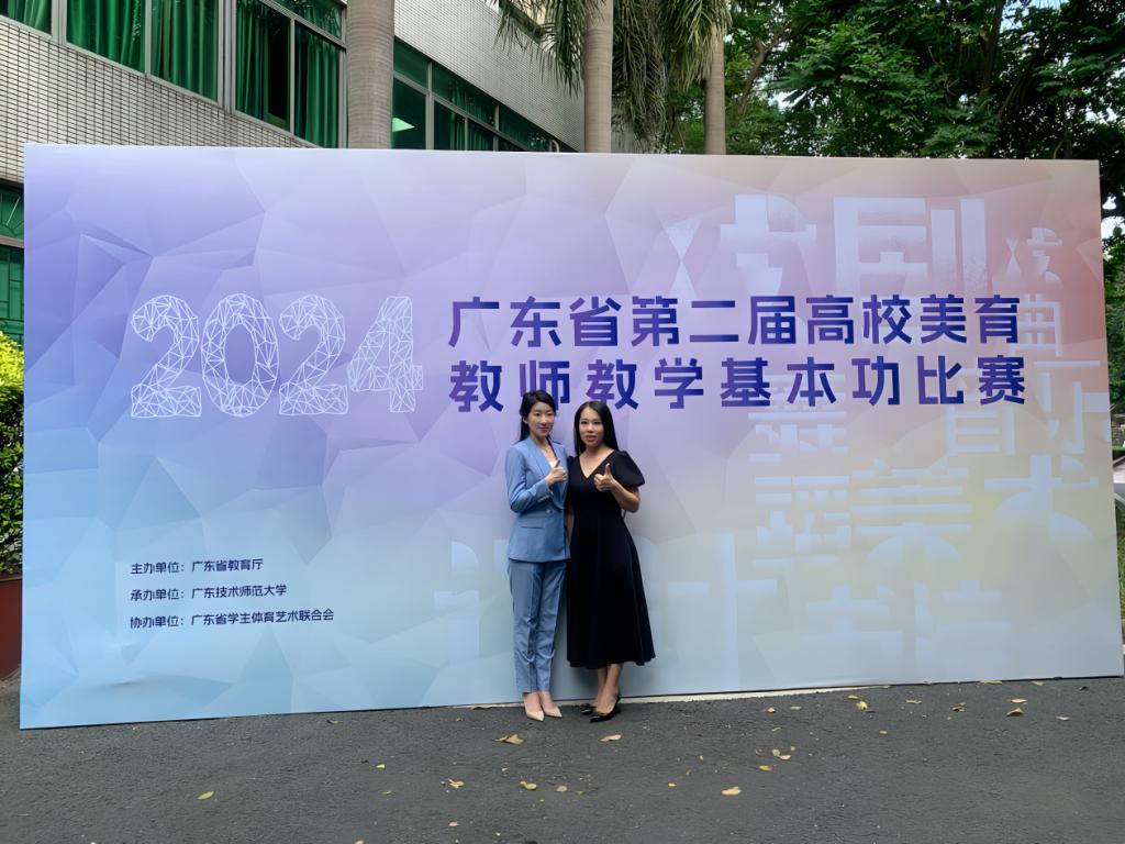 邱思晖老师(左一)和郭思遥老师(右一)参加2024年广东省第二届高校美育教师教学基本功比赛